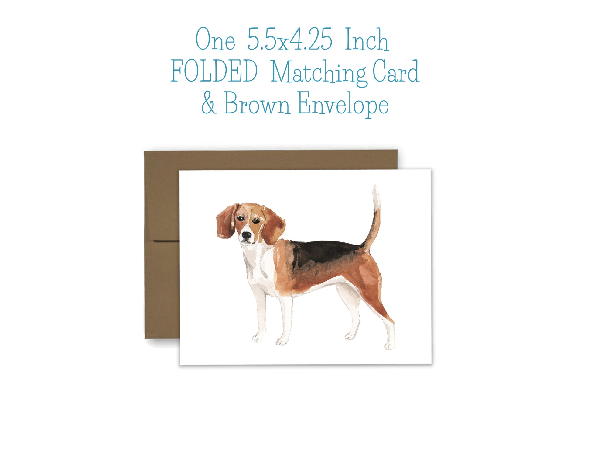 The personalized stationery set includes a watercolor Beagle Dog design with a name on a notepad in either 4x6 or 5x7 inches with either 50, 75 or 100 pages, one matching 5.5 x 4.25-inch folded note card with a brown envelope, two matching 3-inch waterproof Beagle Dog stickers and two matching 3-inch waterproof dog lover stickers. The notepad arrives in a gift box perfect for a gift for yourself or for a friend.