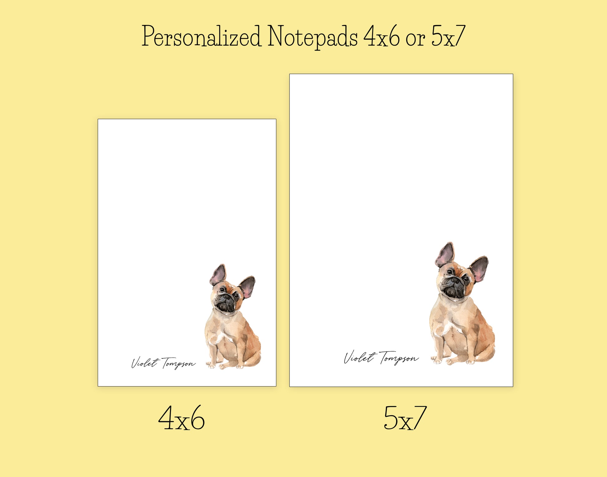 The personalized stationery set includes a watercolor French Bulldog Dog design with a name on a notepad in either 4x6 or 5x7 inches with either 50, 75 or 100 pages, one matching 5.5 x 4.25-inch folded note card with a brown envelope, two matching 3-inch waterproof French Bulldog Dog stickers and two matching 3-inch waterproof dog lover stickers. The notepad arrives in a gift box perfect for a gift for yourself or for a friend.