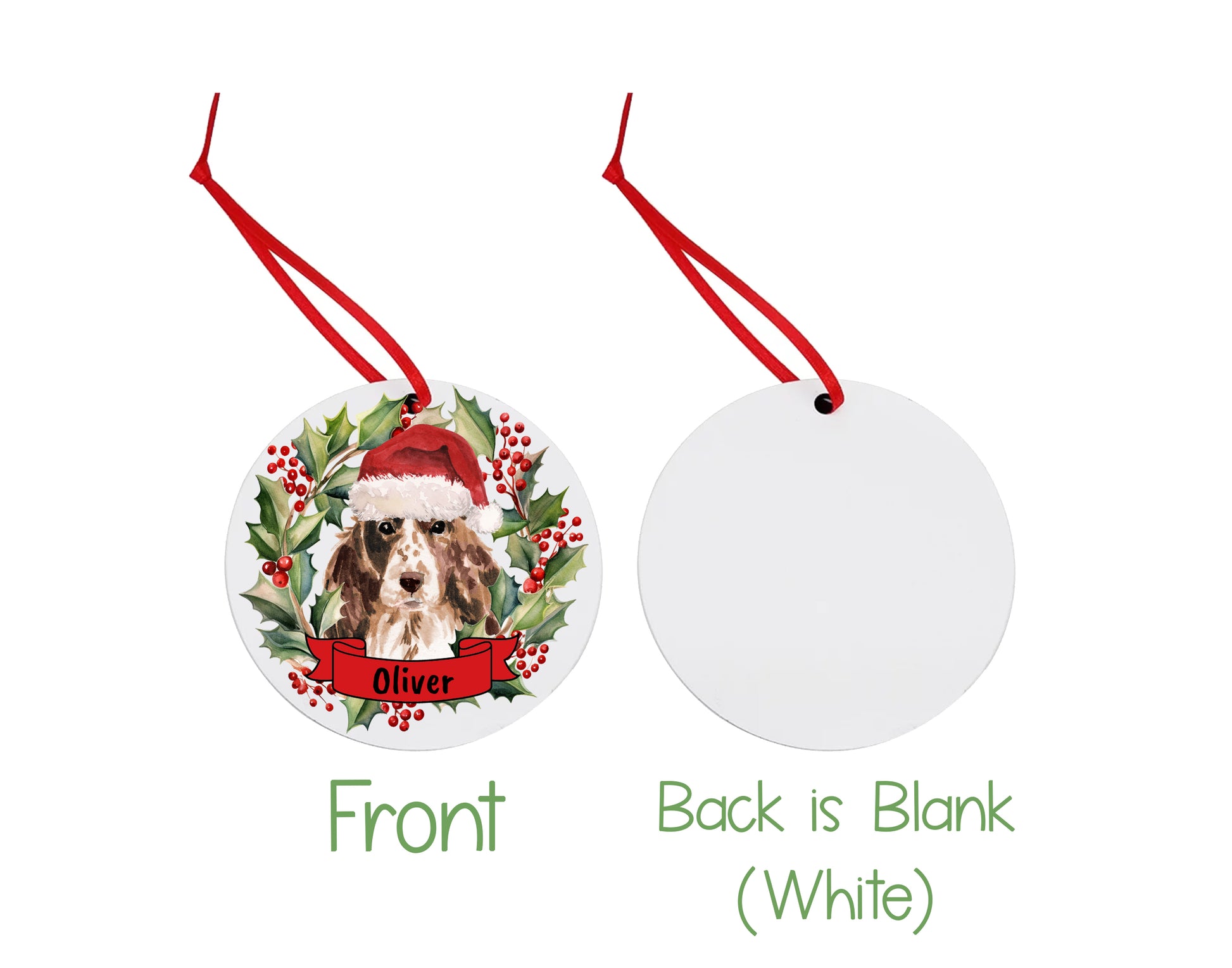 This charming 3x3-inch watercolor Christmas ornament features an adorable dog wearing a festive Santa hat, surrounded by a delicate holiday wreath. The front of the ornament showcases the personalized name of your dog, making it a special keepsake for the season, while the back remains blank and white for a minimalist touch. As a delightful bonus, the ornament comes with two matching Santa hat dog stickers. Presented in a gift box, this ornament is ready to be gifted or kept as a treasured decoration for your own tree. Perfect for adding a personalized, cozy holiday vibe to any home!