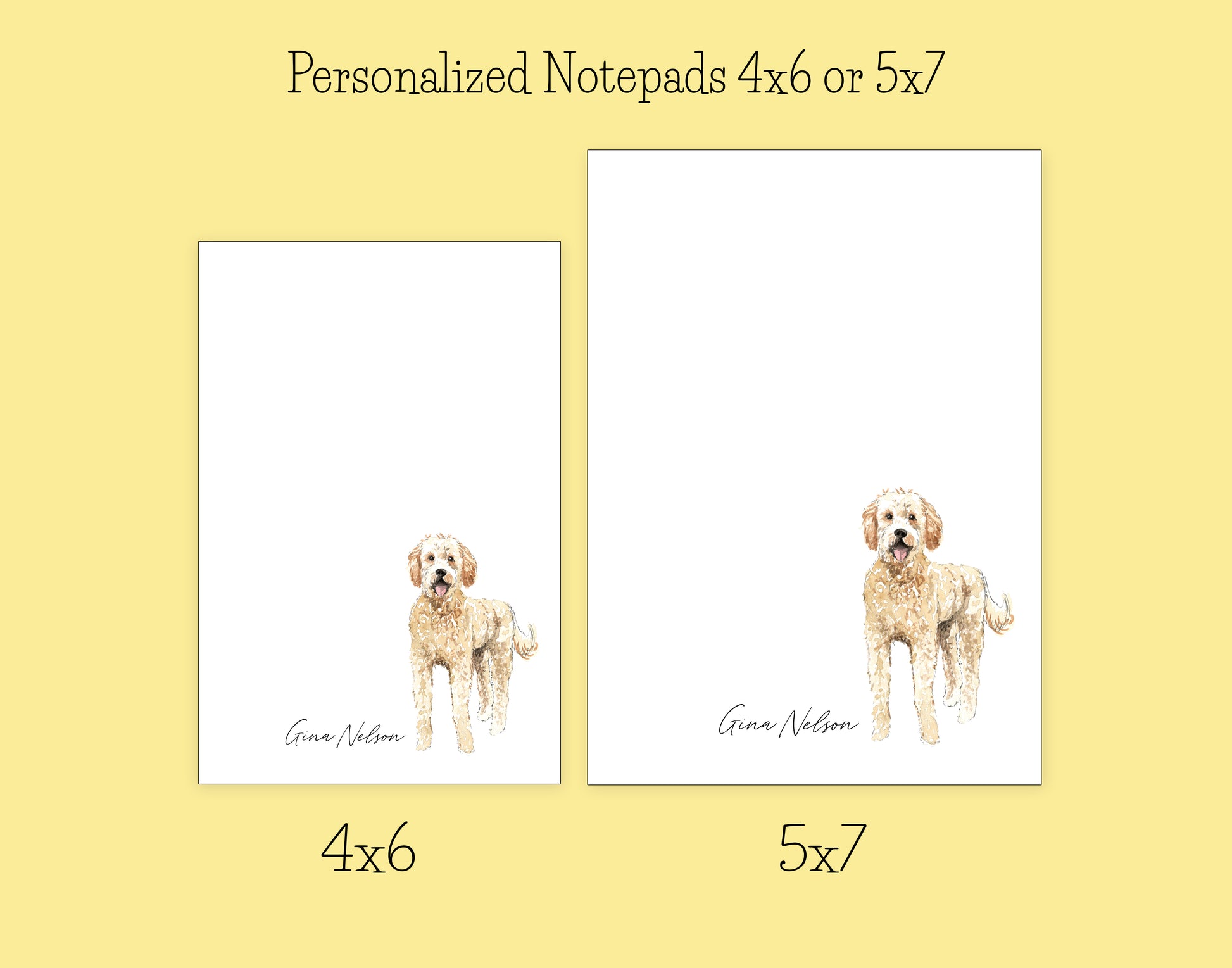 The personalized stationery set includes a watercolor Goldendoodle Dog design with a name on a notepad in either 4x6 or 5x7 inches with either 50, 75 or 100 pages, one matching 5.5 x 4.25-inch folded note card with a brown envelope, two matching 3-inch waterproof Goldendoodle Dog stickers and two matching 3-inch waterproof dog lover stickers. The notepad arrives in a gift box perfect for a gift for yourself or for a friend.